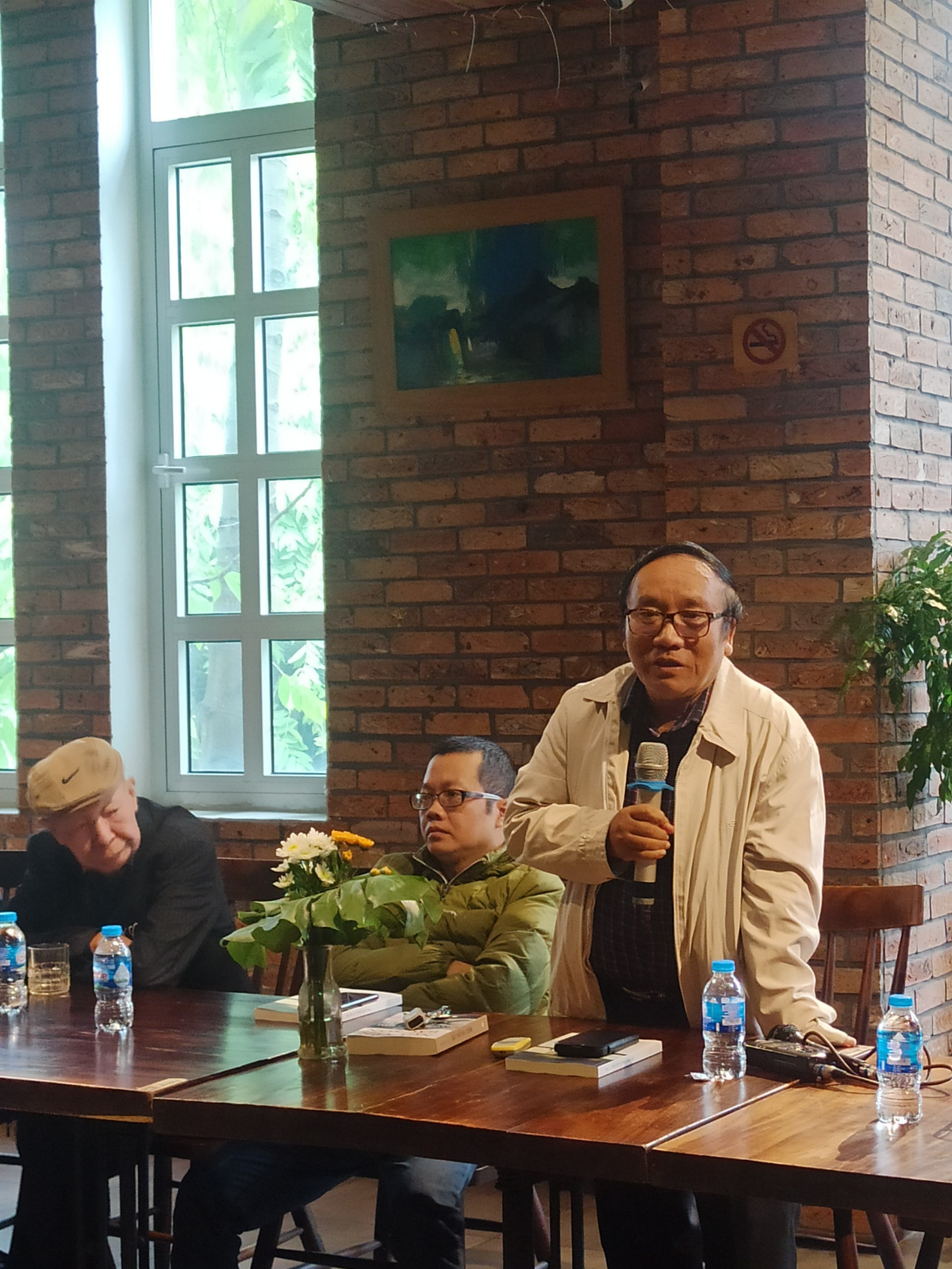 Từ phải sang trái: họa sỹ Lê Trí Dũng (đứng), nhà thơ Nguyễn Bá Chung, nhà thơ Nguyễn Duy