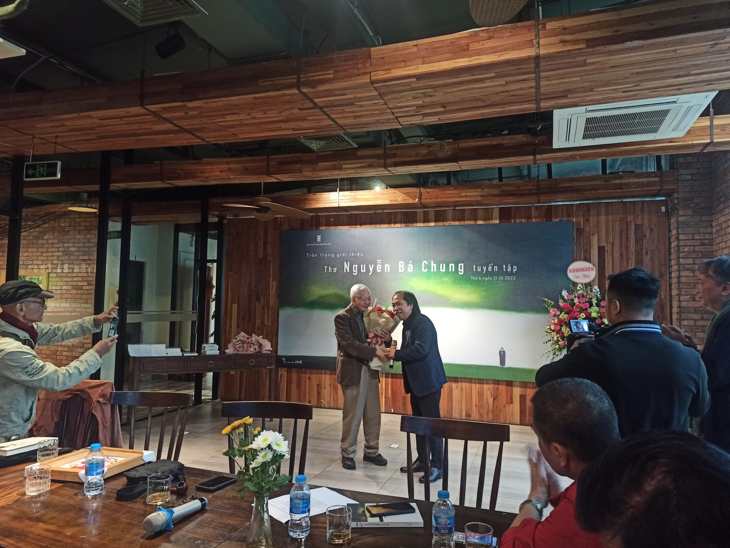 Nhà thơ Nguyễn Quang Thiều (bên phải) tặng hoa tác giả Nguyễn Bá Chung